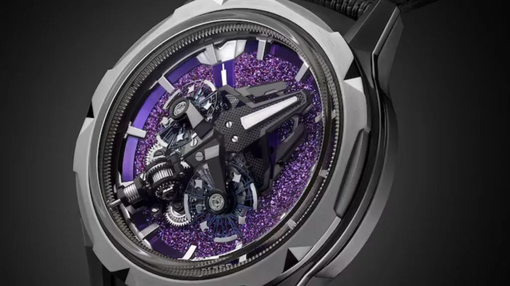 This unique reference has a vividly coloured crystalium base plate with a shimmering violet tint. Crystalium is formed by crystallising ruthenium, a process that takes days and gives every piece a unique finish. The watch is attached to a “ballistic” rubber strap with a woven appearance and light purple stitches that complement the regal colour scheme.