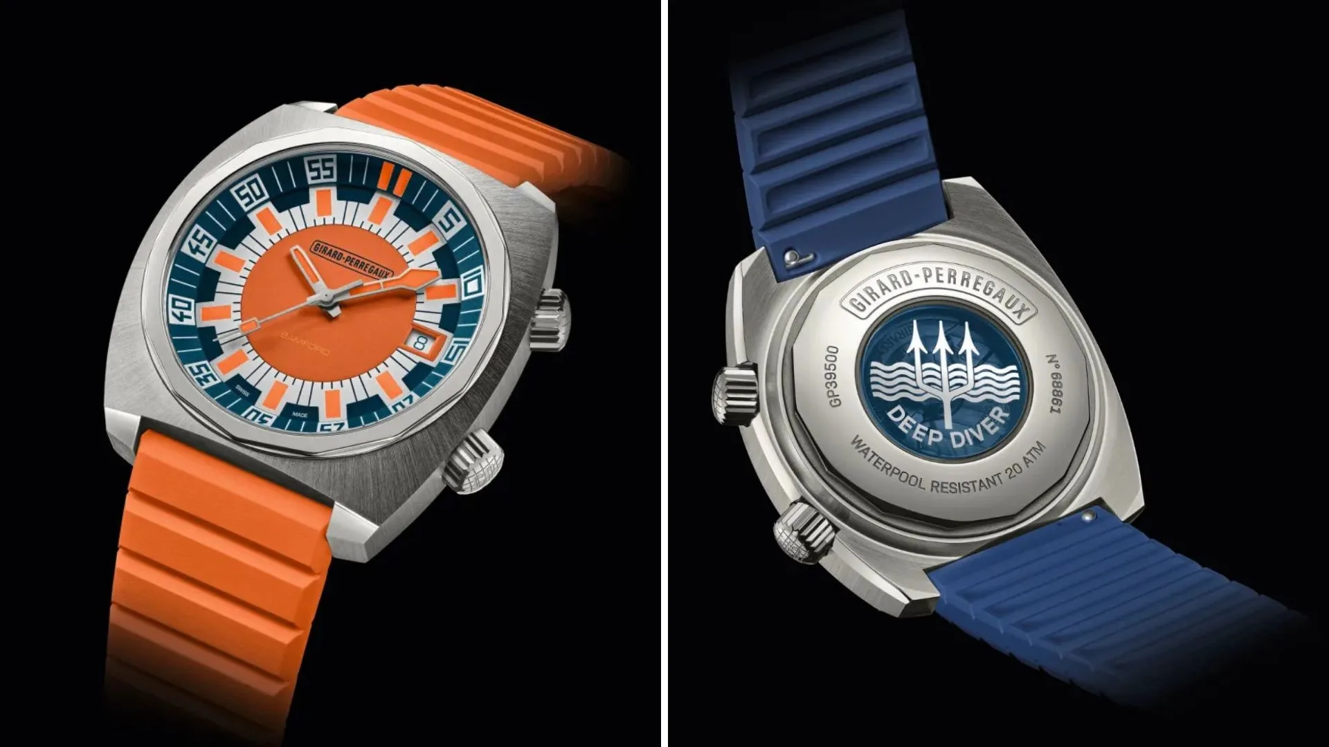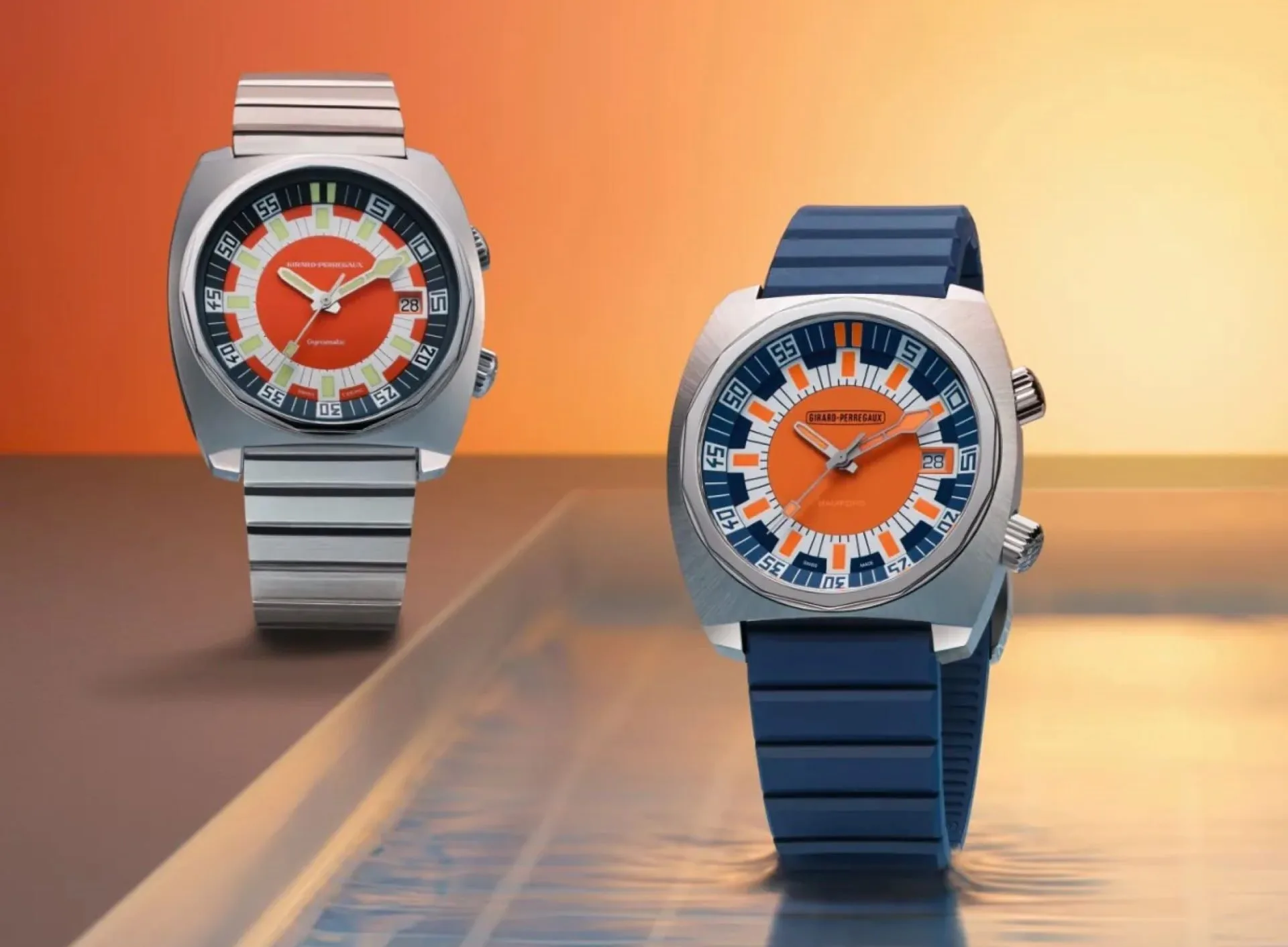 A quick-release strap system adds convenience, with both blue and orange rubber straps included for easy swaps. Inside, the slim self-winding GP03300 calibre offers a 46-hour power reserve and is beautifully finished with Geneva stripes, polished bevels, and a trident emblem that pays tribute to the brand’s rich 234-year watchmaking heritage.