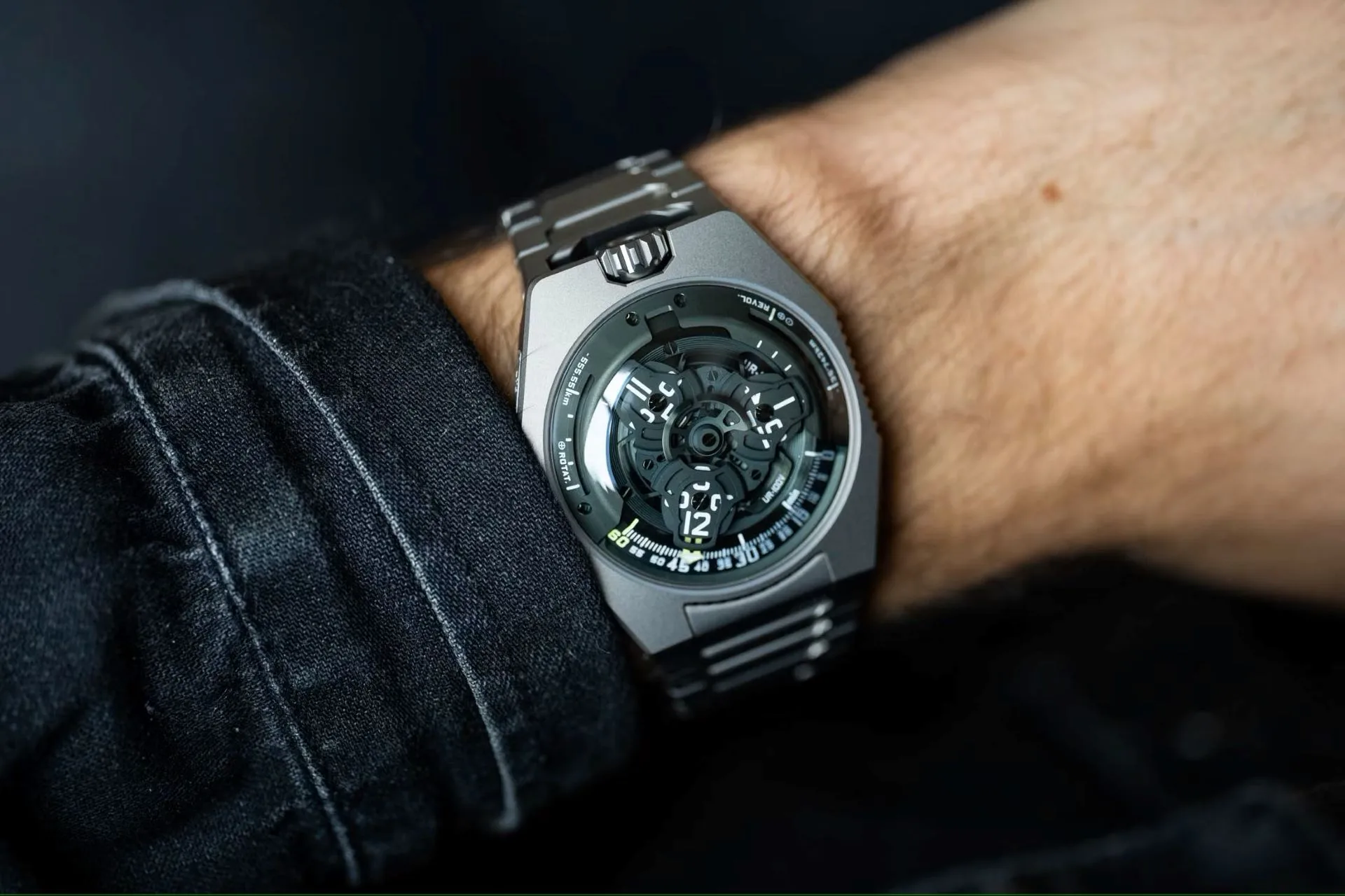 The dial might look complex, but reading the time is surprisingly straightforward. A neon green arrow points to the minutes, while the corresponding hour number glides into place above it.