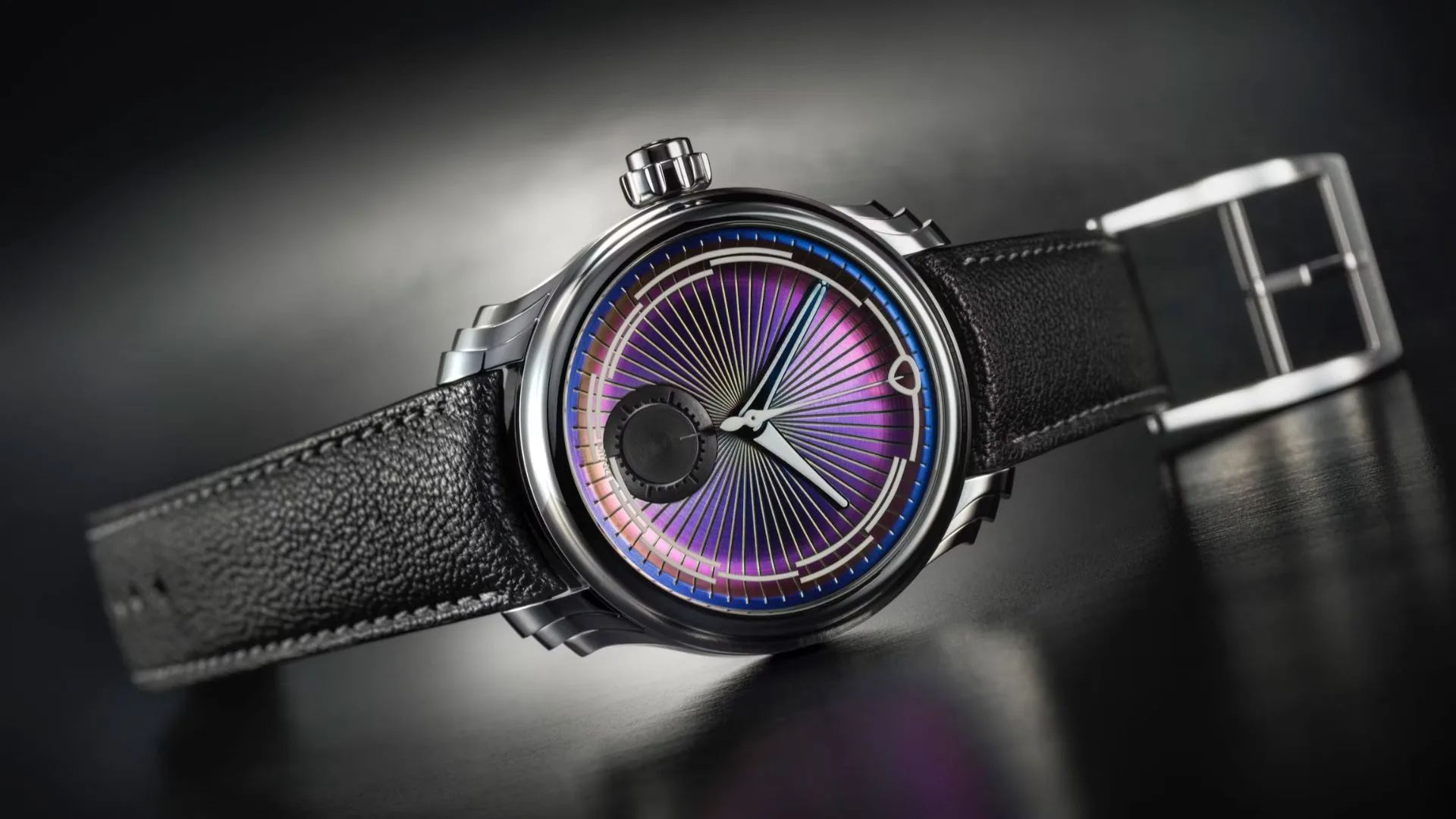 The highlight of the 57.04 Iris is its chameleon-like dial. Depending on the light, it shifts across shades of purple, blue, and green, creating a dynamic visual effect. Laser-cut luminous indices appear beneath the sapphire crystal, while the chronograph minute counter at six o’clock offers a striking contrast with its circularly brushed black finish. The result is a dial that feels bold yet balanced.