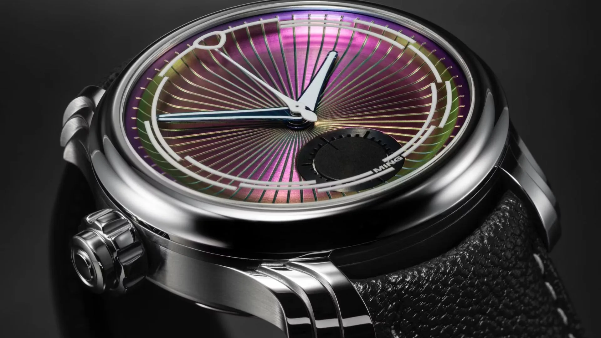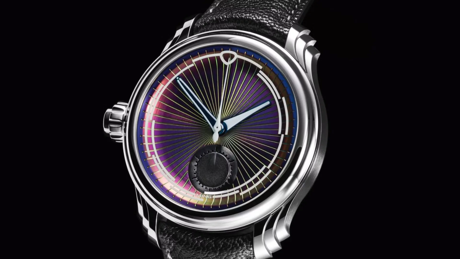 For the first time, Ming is presenting a left-handed or “destro” model. The oversized crown, which also functions as the single chronograph pusher, is positioned on the left side of the 40 millimetre stainless steel case. With its triple-stepped lugs, polished and brushed finishing, and water resistance of 100 meters, the Iris blends Art Deco curves with Ming’s modern identity.