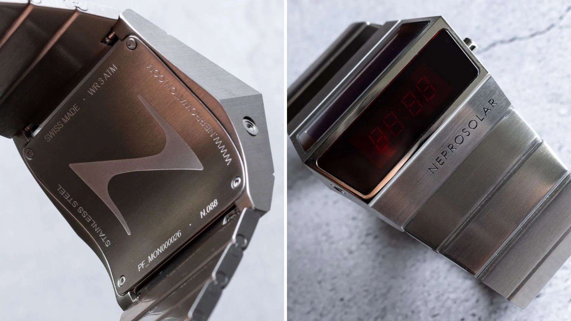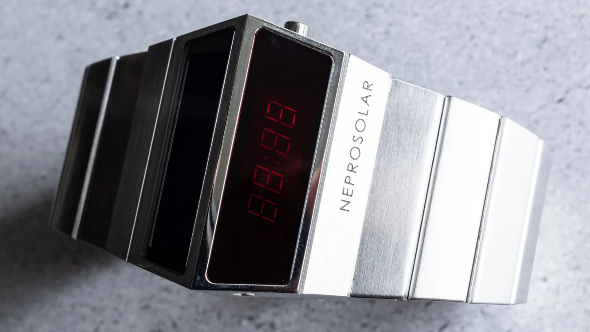 The Neprosolar stands out with its boomerang-shaped steel case and driver-style display, tilted for easy reading while keeping your hands on the wheel. Its OLED red light display brings back the glow of classic LED watches but with brighter legibility, even in sunlight. Time and date functions are activated with a push of a button, keeping the experience authentic to the original 70s design.