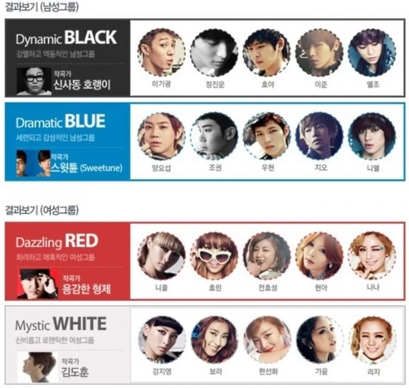 The groups were divided into “Dynamic Black” (with Shinsadong Tiger), “Dramatic Blue” (with Sweet Tune), “Dazzling Red” (with Brave Brothers), and “Mystic White” (with Kim Do Hoon).