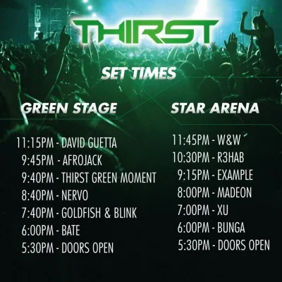 The moment that everyone has been waiting for has finally arrive. Here’s the set times for Thirst 2013 this Saturday, December 14th, 2013!