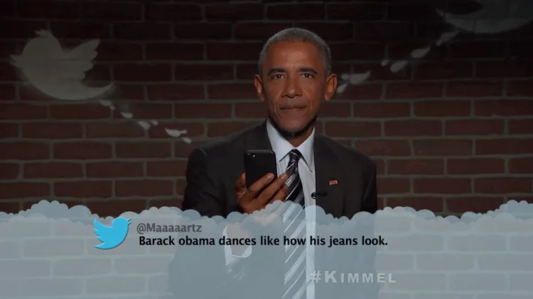 During his 2nd appearance on the show, Obama willing read some of the nastiest things said about him on Twitter. This includes one calling him the “Sharknado of presidents”, another simply calling him “gross”, a direct insult towards his infamous “Mom jeans”, and of course, one from Republican presidential candidate and notorious Twitter rambler/addict himself aka Donald Trump.
