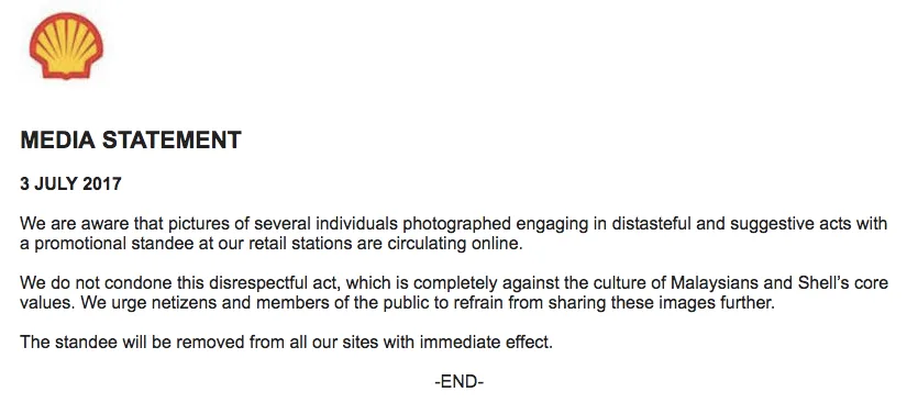 Shell has stepped up to address the issue regarding the “harassment” of Shafila’s pop-up posters! In an e-mail statement, the company said that they are aware of the disrespectful photos and will remove the standee from all their sites immediately.