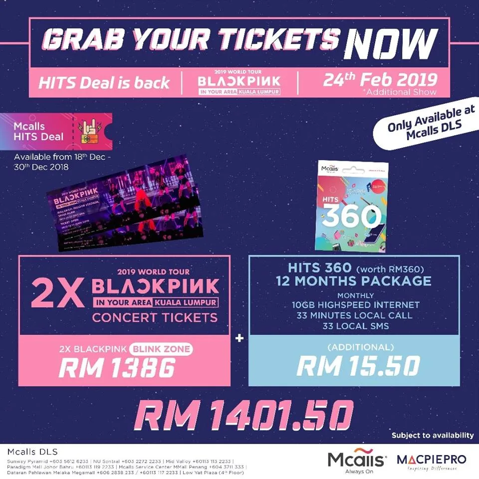 BLINKS can also purchase the tickets at Mcalls Digital Lifestyle Stores in NU Sentral, Sunway Pyramid, Mid Valley Megamall, Dataran Pahlawan Melaka Megamall, Paradigm Mall JB, Mcalls Service Center MMall Penang and Mcalls booth at Low Yat Plaza (4th Floor).