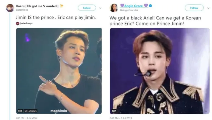 K-pop fans, or more specifically ARMYs, have been pushing for Jimin (박지민) from BTS (방탄소년단). Their reasoning? The 23-year-old K-pop star has the perfect hair and the jawline to be Ariel’s love interest.