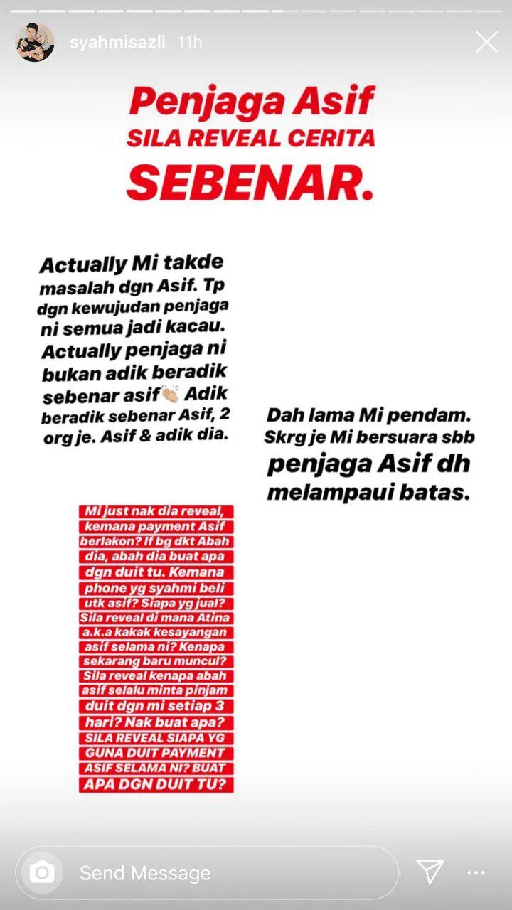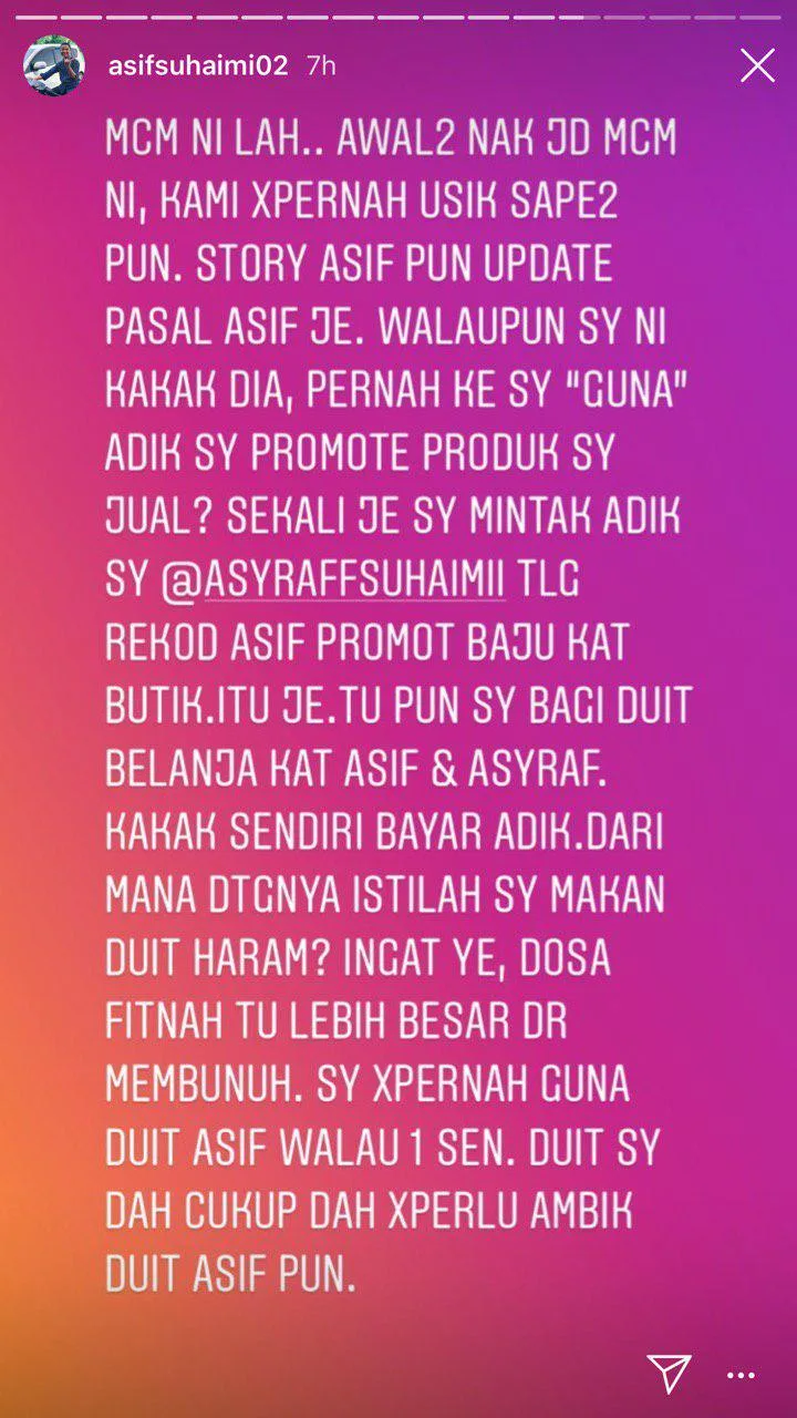 As a respond to that, the “caretaker” – which was later revealed as Asif’s sister – took to Asif’s Instastory to clarify the whole situation. According to Siti Nur Atina Suhaimi, what exactly happened is not like what Syahmi had claimed online. She further added that there were still some payment owed by Syahmi.