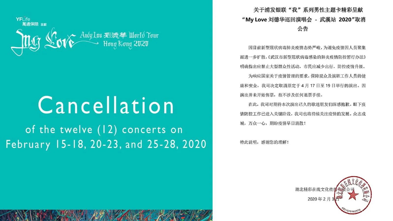 After having to call off shows at the Hongkong Coliseum, Andy was again, forced to cancel 12 of his upcoming February gigs at the same venue. The concert organisers released a statement explaining that this was “to prevent the spread of the virus in such a crowded location” while also protecting the health and safety of concert-goers as well as performers.