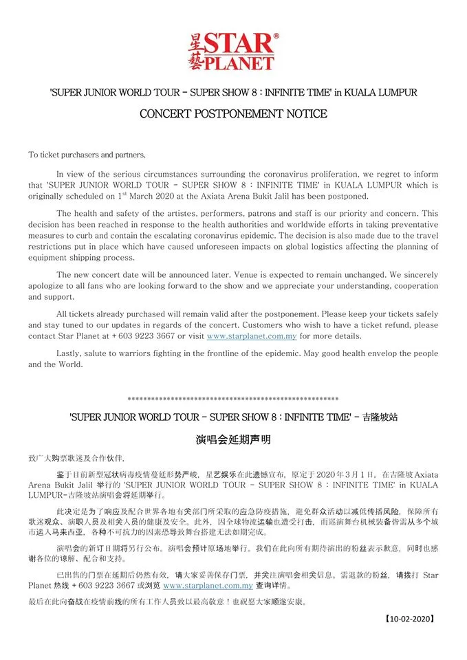 The domino effect has begun. Following SEVENTEEN’s concert cancellation, StarPlanet has just announced that Super Junior’s “Super Show 8: Infinite Time” tour will be put on hold.