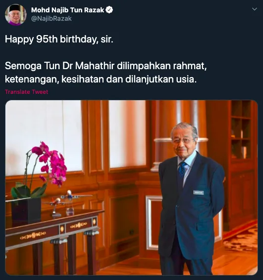 “Happy 95th birthday, sir. May Tun Dr. Mahathir be blessed with grace, peace, health and a long life,” Najib wrote on the caption. At the time of writing, his post has gained over 11,000 likes and 4,000 retweets on Twitter.