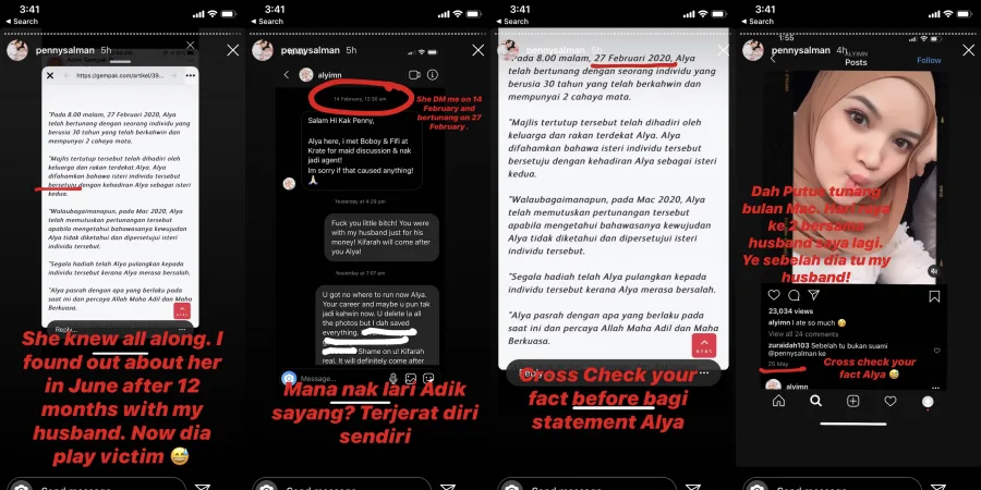 According to the wife Penny Salman via Instagram Story, Alya has been living a luxurious life thanks to her wealthy husband’s money for over 12 months. Apart from that, Penny claimed that the 19-year-old often followed Mr. M when he was working abroad. He even gifted her with tons of branded products throughout their time together.