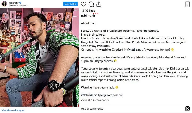 “The sword is aimed at those culprits out there who often sent indecent images to my fiancee. Grow up and stop making a fool out of yourself,” warned Nabil. He further added that the individuals don’t seem to give up, despite having their accounts blocked several times in the past.
