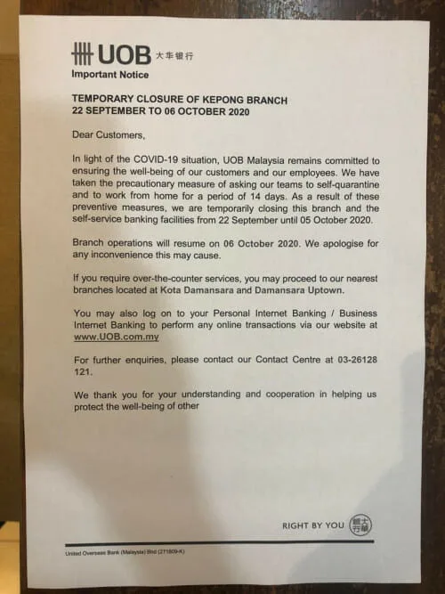 An employee from UOB Malaysia Kepong has tested positive for Covid-19. Following the positive testing of this employee, the Bandar Menjalara branch has issued a statement announcing that they will be temporarily closed from 22nd September to 5th October 2020.