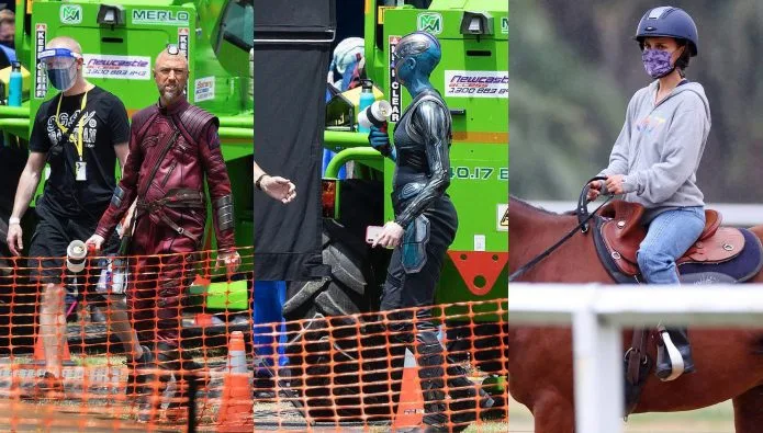 Besides Hemsworth and Pratt, other behind-the-scenes photos also include Sean Gunn, who plays Kraglin (notice the new cybernetic headpiece inspired by Yondu?), and Karen Gillian as Nebula. Natalie Portman, who plays Lady Thor, was spotted last week undergoing her horse training.