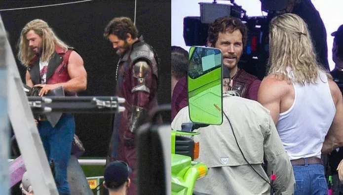 Hemsworth was spotted in his iconic long blonde wig while carrying his stormbreaker axe around set. Meanwhile, Pratt was donning Peter Quill aka Star Lord’s red armour as the 2 leading men chatted in between takes. Perhaps they were swapping some fashion tips?