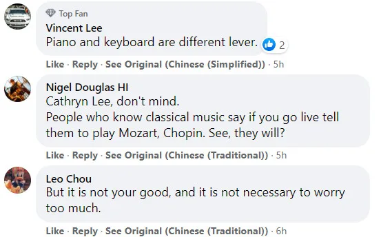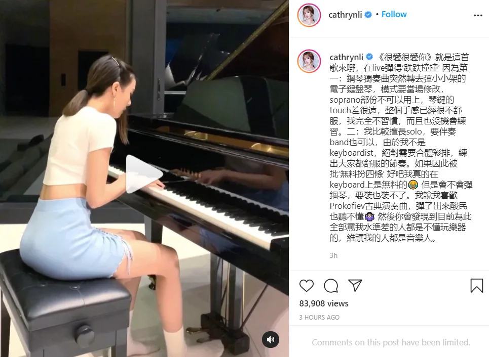 The song Ms. Cathryn plays on the piano is “很愛很愛你” (I love you very much) by René Liu. It is the same song she played during the live FB show. In her post, she lists two main reasons why she struggled to play that day.