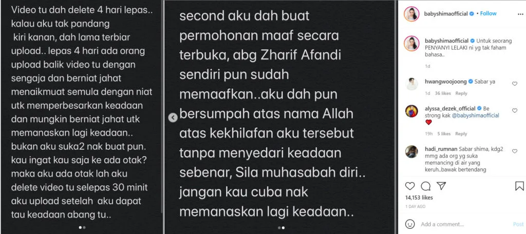 Shima also mentioned that Afandi had accepted her apology and swore she made the mistake unknowingly. “Don’t try to heat things up again,” she stated directing her post to “a certain male singer who doesn’t understand (Malay)“.