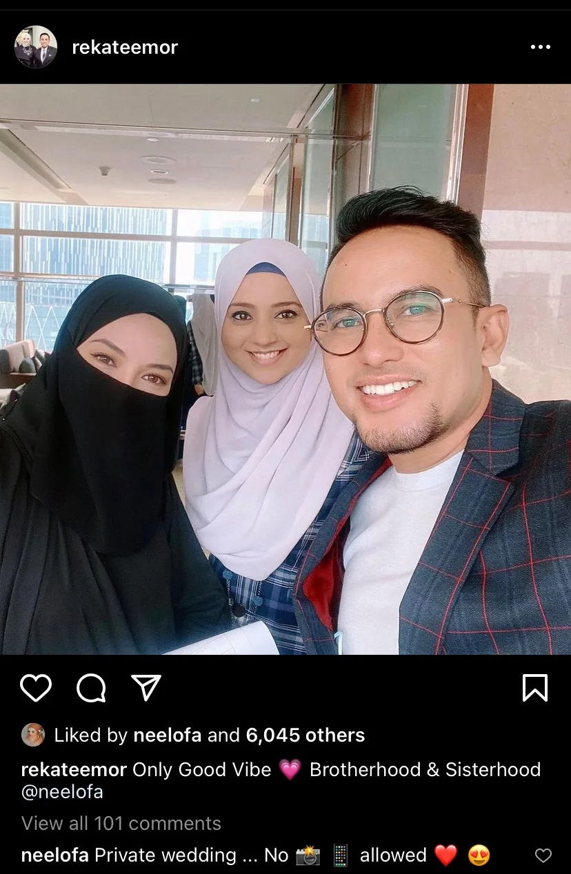 The photo was posted on Reka Teemor’s official Instagram account, along with the caption, “Only good vibes ? Brotherhood & sisterhood @neelofa.”  Many have since started assuming that the local celeb’s wedding reception with her husband, PU Riz, is currently underway.