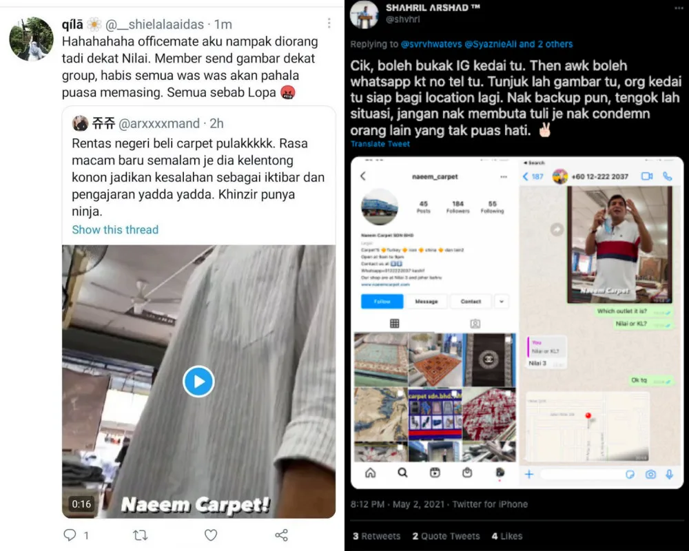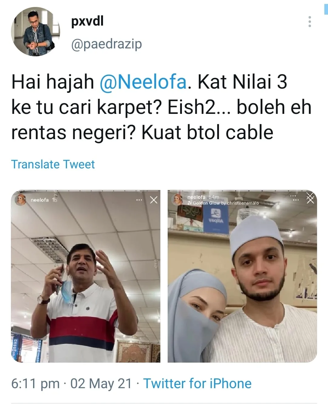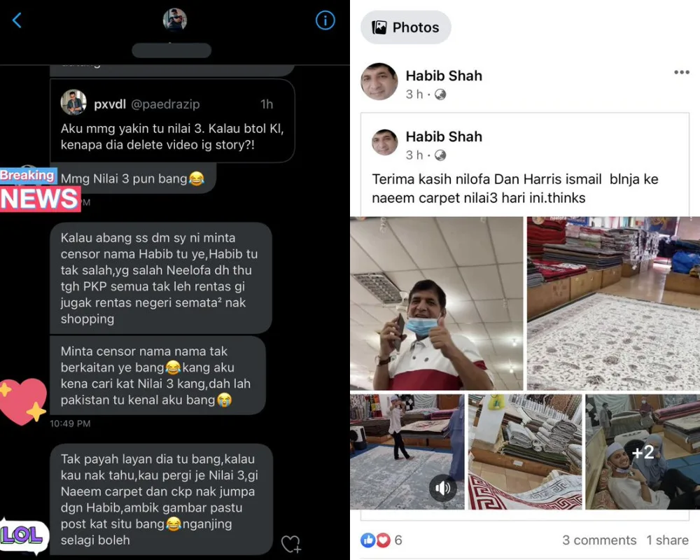 Over the weekend, one Twitter user, @paedrazip, shared two screenshots taken from Neelofa’s IG Story, showing the husband-and-wife duo visiting a carpet shop, presumably located in Nilai 3, Negri Sembilan.