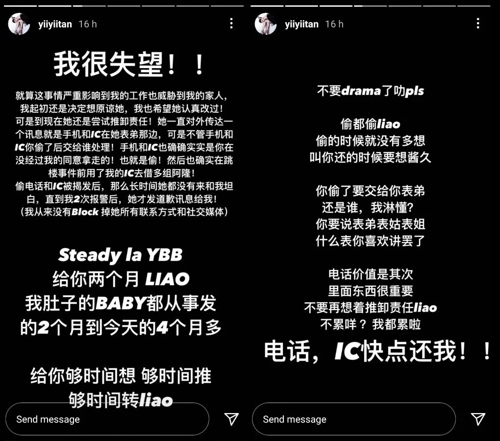 YBB explained in an Instagram story that the situation is out of her control. According to her, the items are with another person, whom she will not disclose. She offered to compensate for Tan’s phone but apologised for not being able to do more. In response to that, Tan said that stealing was still a crime and the phone itself wasn’t valuable, it was the information contained in it. “Stop thinking (about how to) shirk responsibility,” Tan wrote. “Aren’t you tired? Cos I am.”