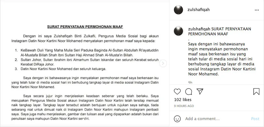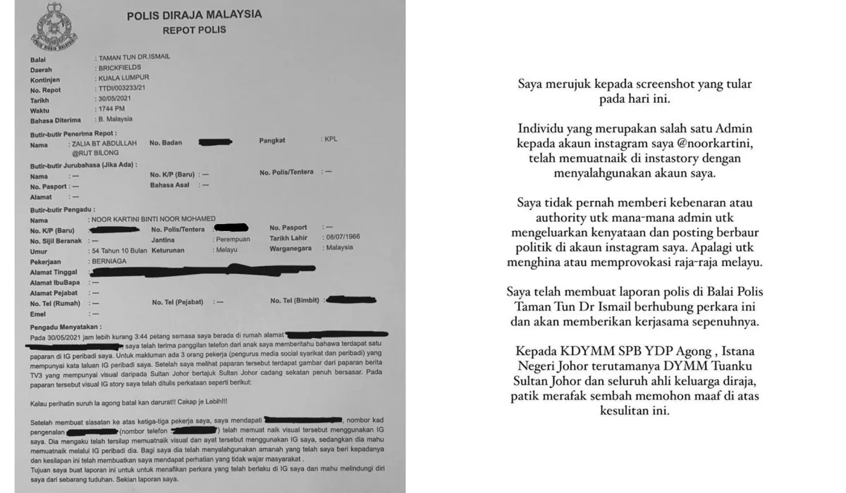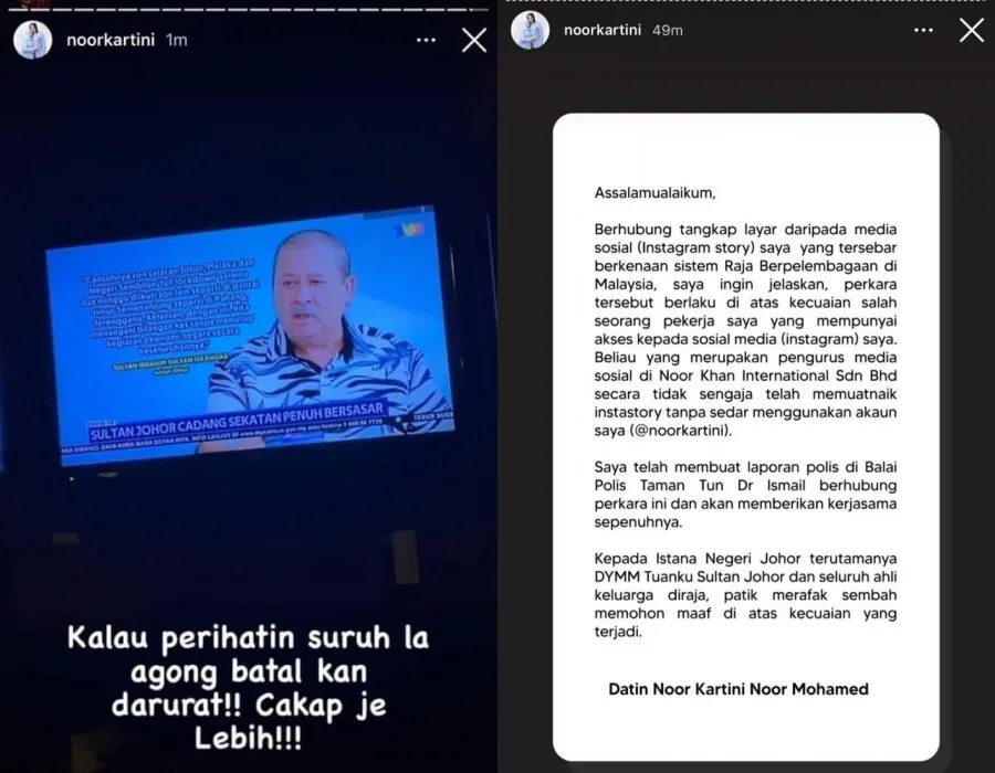 Kartini explained, “Regarding the screenshot from my social media (IG Story) about the Constitutional Monarchy system in Malaysia which went viral, I’d like to explain that this happened due to the negligence of one of my employees who has access to my social media (Instagram).” She also revealed that she had filed a police report and will give her full cooperation on the investigation.