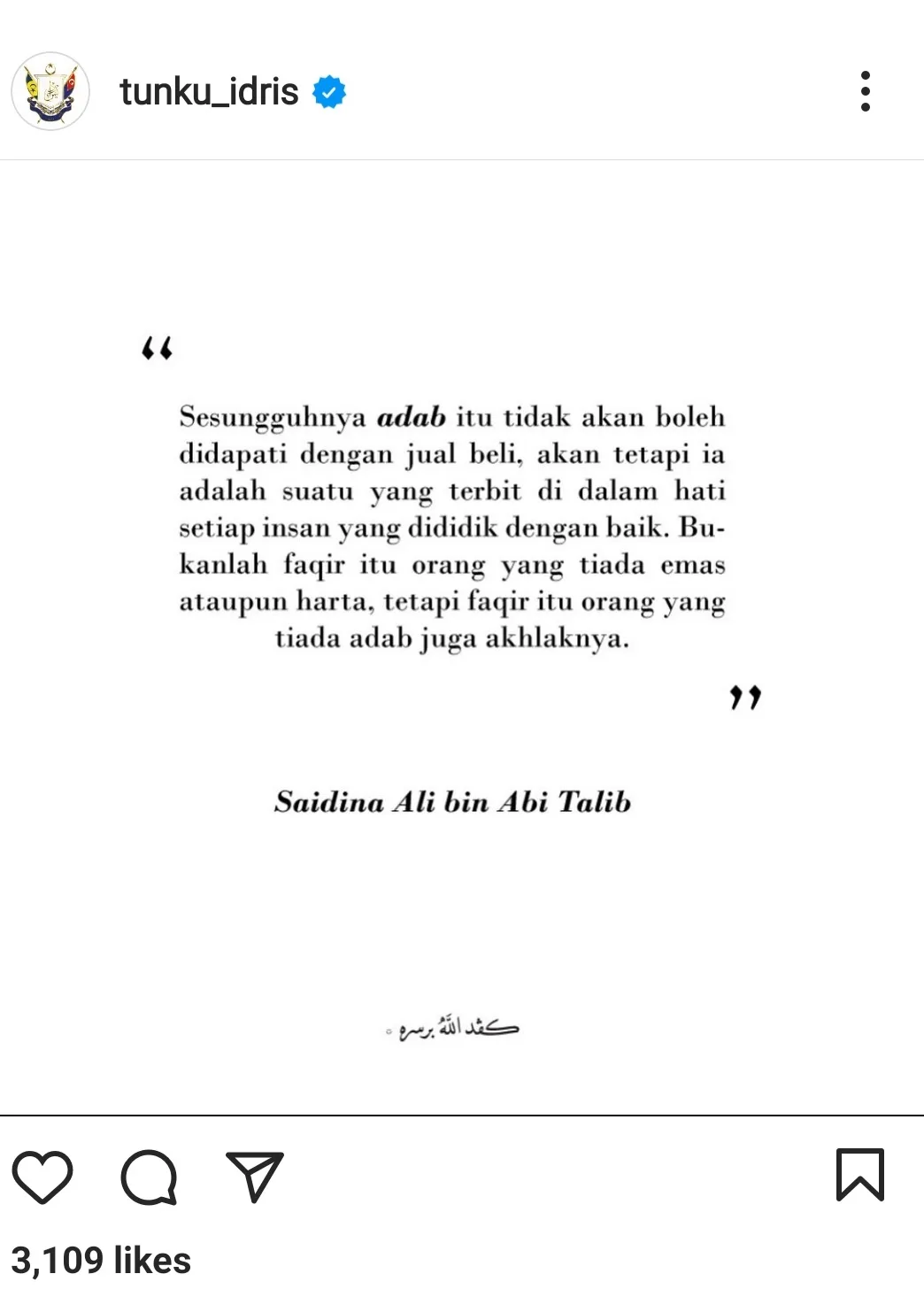 Subsequently, the 33-year-old Johor prince also took to his Instagram to share a quote from Prophet Muhammad’s cousin, Saidina Ali ibn Abi Talib. “Indeed, ‘adab’ (manners) cannot be obtained by trading, but it’s something that comes from the heart of every well-educated human-being,” Tunku Ismail shared.