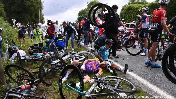 German cyclist Tony Martin was the first to collide with the sign. It caused a chain effect as several other cyclists trailing behind him tumbled from their bikes as well. The crash resulted in injuries of varying seriousness, causing three to drop from the competition. One was another German cyclist, Jasha Sütterlin as he was suffering from a large hematoma. “It looked like a war zone,” one official commented.