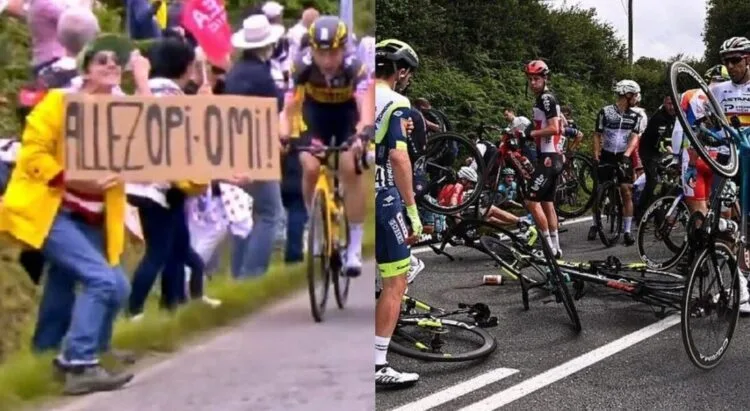 During the first stage of the Tour de France, the lady was standing at the edge of the road with a large cardboard sign. The fan was wearing a red and white striped sweater with a yellow jacket and a pair of blue jeans. She also had a cap and glasses on. Her sign had the words “Allez Opi-Omi!” which is a mix of French and German that can be translated to “Go grandpa grandma!”