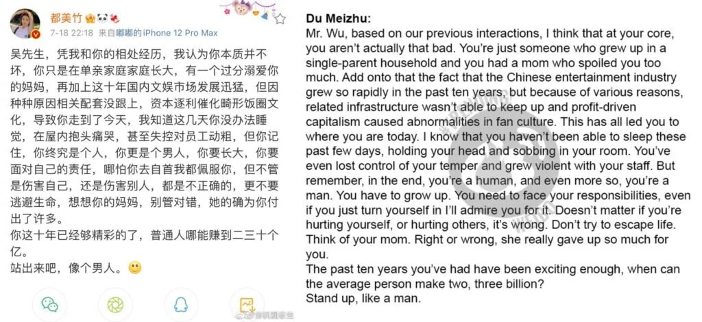 In another post, Du revealed that she didn’t think of Wu as a “bad person”. “You just grew up in a single-parent home and has a mom who spoils you too much. Add that to your rapid expansion in the Mainland entertainment scene, but due to various reasons your relevant requirements didn’t match up, resulting in profit-chasing capitalism being a catalyst for the deformation of fan culture,” she wrote.