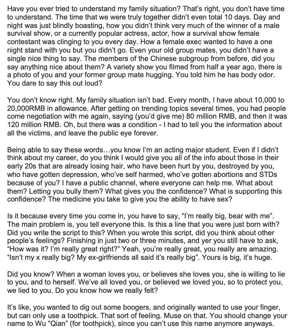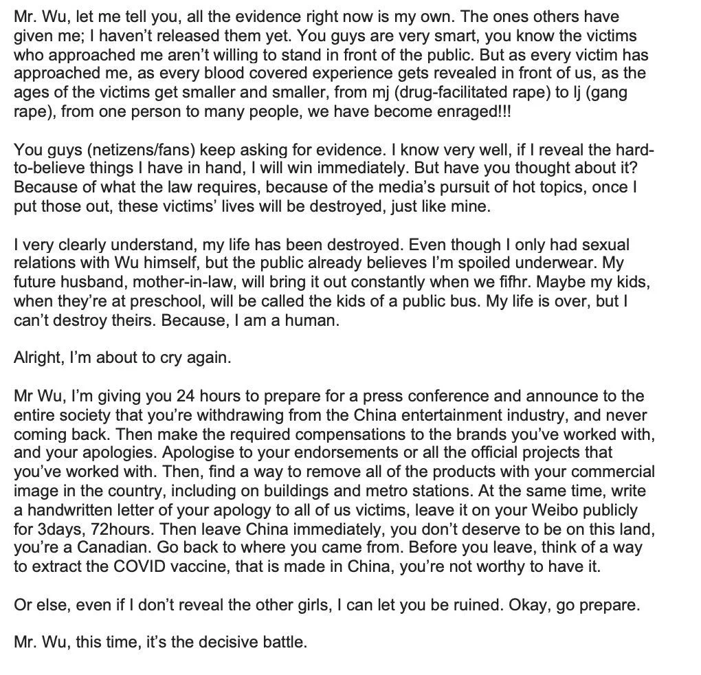 Following the interview, Du came up with a lengthy post, throwing an ultimatum to the former EXO member after receiving tremendous backlash and threats from his fans and netizens. “Mr. Wu, I’m giving you 24 hours to prepare a press conference and announce to the entire society that you’re retiring from the (China) entertainment industry, and never coming back,” she wrote.