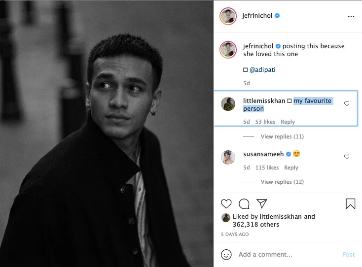 Not only that, fans became more convinced that both Jefri and Ameera are indeed dating when another actor, Adipati, replied to Jefri’s post by asking, “Who loves this one (photo)?” In this case, one Instagram user assumed that the “Dear Nathan” star was actually referring to Ameera (also known by her social media moniker Little Miss Khan) in his caption.