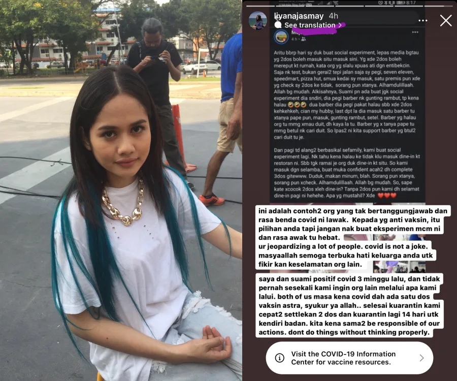Through an IG Story post, Liyana shared a screenshot of an anti-vaxx individual who conducted a “social experiment” by dining in at restaurants despite not being fully vaccinated.