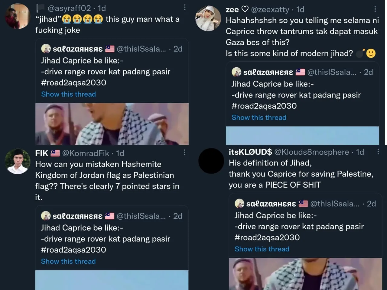 Many also doubted his real purpose as the 33-year-old rapper’s two months stay in Jordan was supposed to carry out a humanitarian aid mission in Palestine. Netizens also criticised Caprice for going against the original intention of wanting to help the Palestinians. Some even pointed out that the flag used in the video was not even a Palestinian flag. Comments left by netizens include: