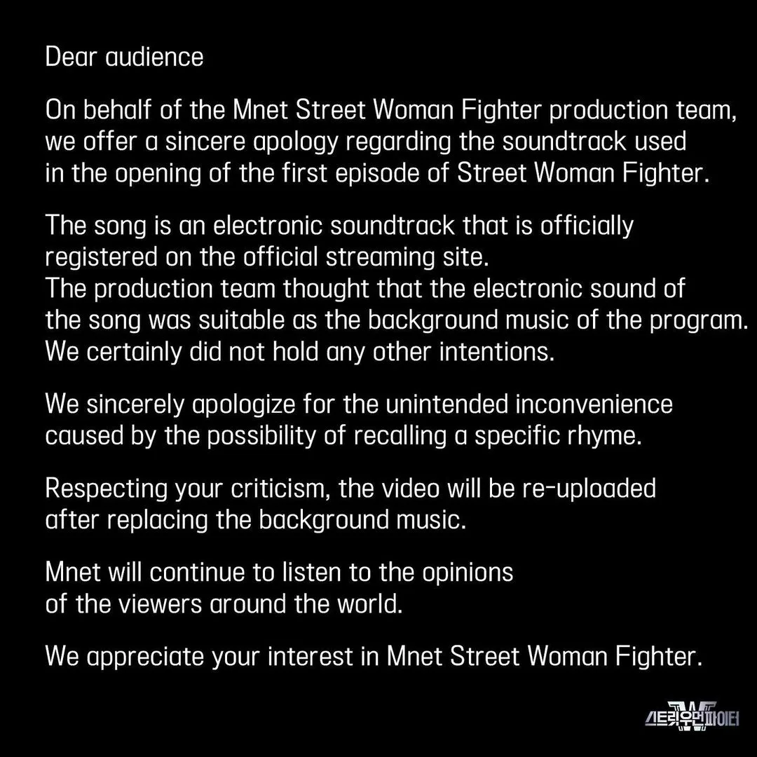 After facing massive backlash from the public, the production team of Mnet’s “Street Woman Fighter” has finally issued an official apology for the controversial incident that took place recently. In the official statement posted on their Instagram, they also revealed that they will re-upload the clip using different background music and promised to listen to the opinions of viewers all over the world.