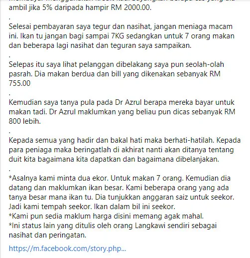 Unfortunately for this man, he ended up paying RM1196.80 for a single Barramundi (ikan siakap) in a restaurant in Langkawi. He claimed the restaurant had misinformed him of its size and stated there was an extra charge when he tried paying with his credit card. The restaurant however, has come forward to clear matters up.
