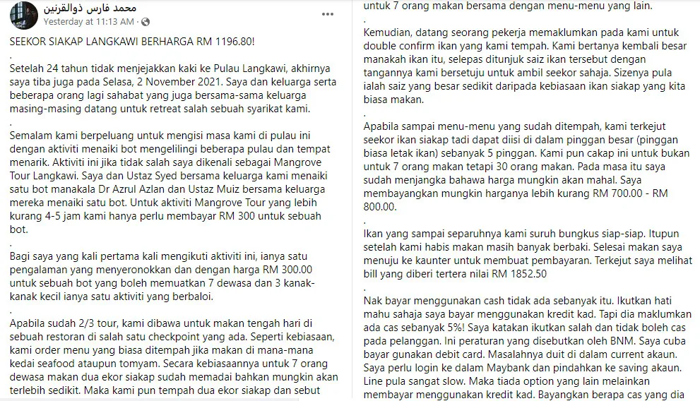 The man, Mohd. Faris Zulkarnain, took to Facebook yesterday (4th November) to alert people of the matter. According to his post, he and his friends went to Langkawi for a retreat with their families. However, they didn’t expect to spend so much cash on a bill during the retreat.