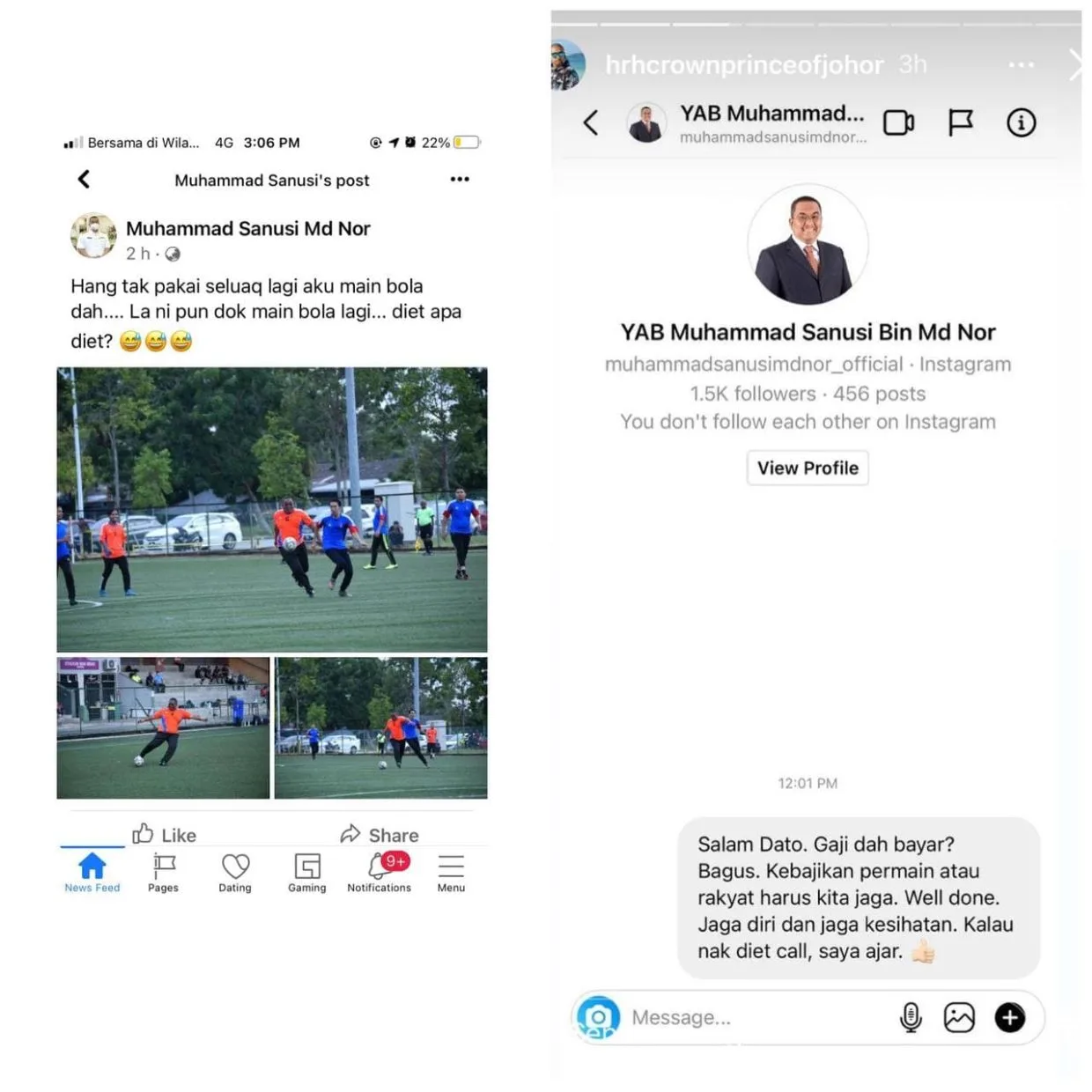 The former Football Association Malaysia (FAM) president later posted a screenshot of his text message to Sanusi. “Greetings Datuk. Have you finished paying all the salaries? Nice. We must take care of the welfare of the players and also the people. Well done, take care of yourself and take care of your health. If you’re planning to go on a diet, just give me a call, I can offer you a lesson,” TMJ wrote.