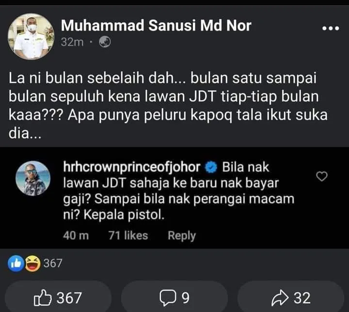 Taking to his Instagram, TMJ expressed, “Are you only paying the salaries upon learning that you will be facing JDT (FC)? How long are you going to behave like this? You’re such a gun head (‘Kepala pistol’).” Clearly, Sanusi wasn’t having any of the statements left by the well-known royal figure!