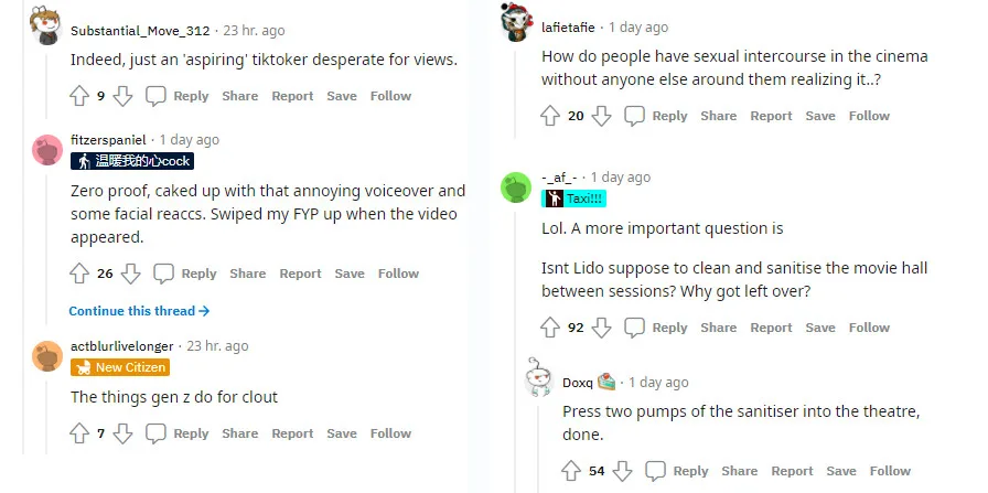 Netizens are doubtful about the incident as many feel she is doing it for clout. One questioned how someone could have sex in the cinema without anyone realising it. Others were curious as to why the cinema hadn’t cleaned or sanitised the hall between sessions.