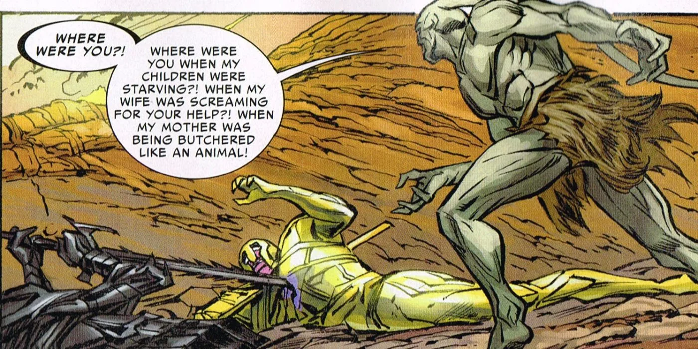 Gorr the God Butcher actually belongs to the unnamed desert planet in the comics, with their people living such miserable lives and offering their prayers to the gods to put a stop to their suffering. When his family all gave in to death, Gorr blamed the gods for not providing him any help or saving them. Because of that, he was labeled as an outcast and was rid from society.