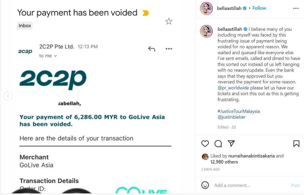 The “Tenang” singer added, “Even the bank says that they had approved (the payment), but you reversed the payment for some reason. PR Worldwide (concert organiser) please let us have our tickets and sort this out as this is getting frustrating.” That being said, it looks like many netizens didn’t react too kindly to Bella’s posting.