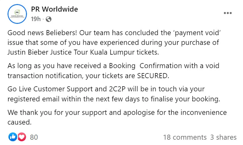 Following all the complaints by fans of the “One Time” hit-maker, PR Worldwide took to its official Facebook page to announce that they have finally rectify the ‘payment void’ issue. You can read their full statement here: