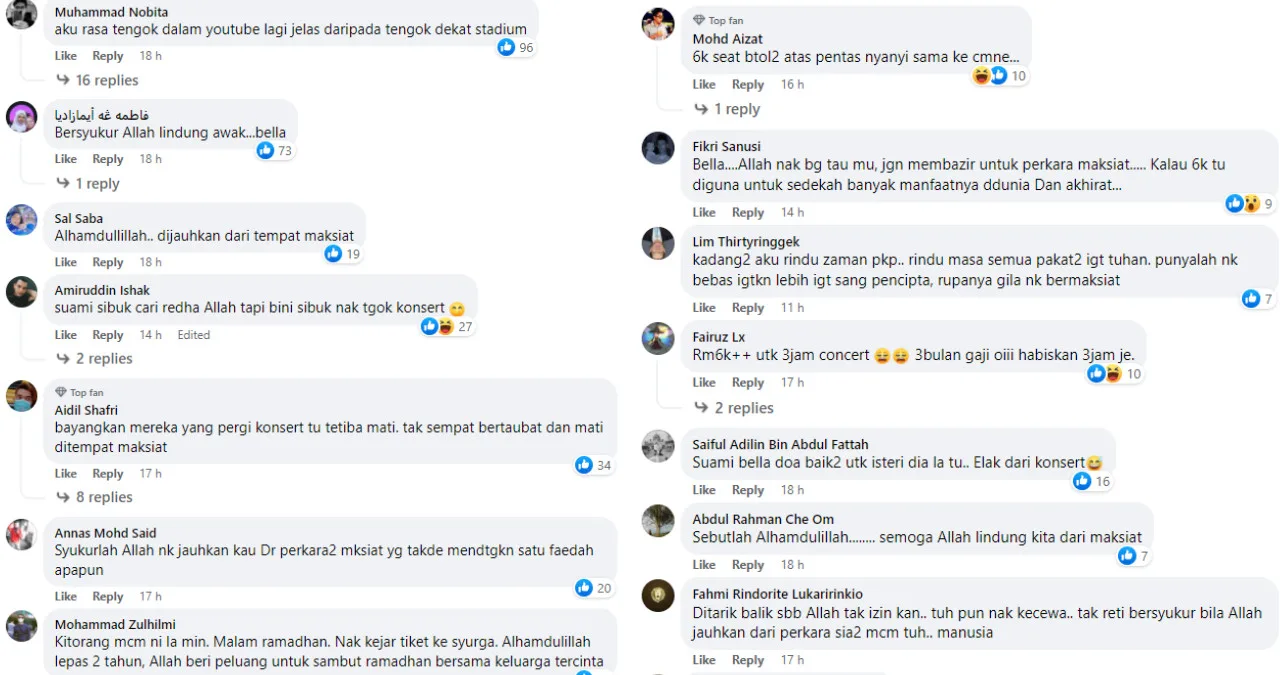 In this case, the replies section has been flooded with comments from a few holier-than-thou commentators on Facebook. “Bella, God is telling you to not to spend your money on immoral activities. It’s better to make use of the RM6 million cash for more beneficial things,” user Fikri Sanusi remarked. Another netizen named Fairuz Lx wrote, “RM6k for a 3-hour long concert? That’s worth 3 months of my salary.”