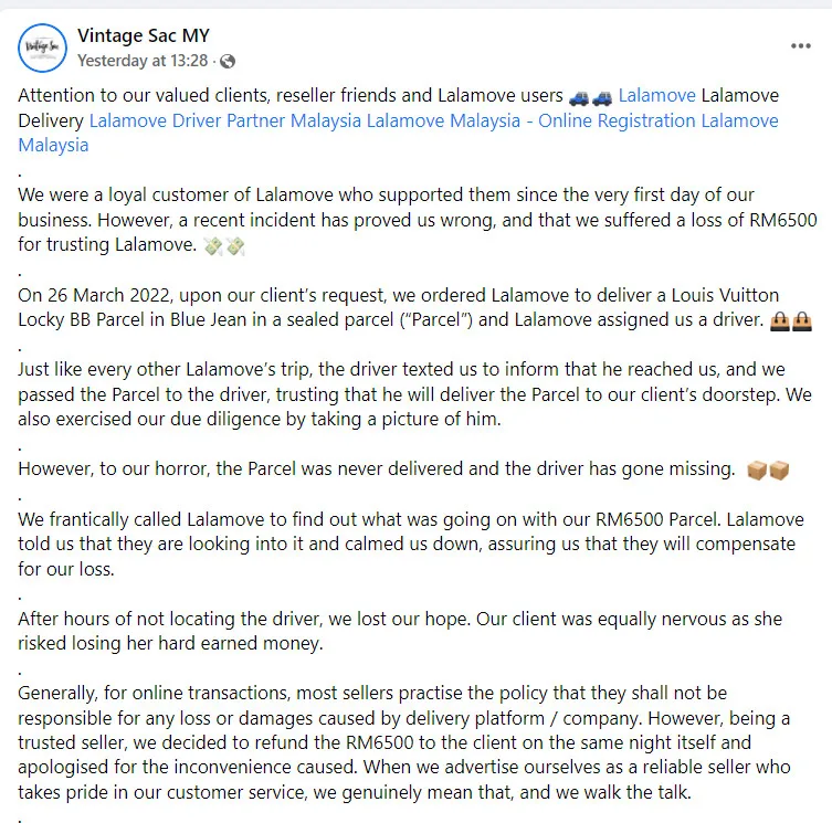 “We were a loyal customer of Lalamove who supported them since the very first day of our business. However, a recent incident has proved us wrong, and that we suffered a loss of RM6,500 for trusting Lalamove. On 26th March 2022, upon our client’s request, we ordered Lalamove to deliver a Louis Vuitton Locky BB Parcel in Blue Jean in a sealed parcel, and Lalamove assigned us a driver,” the online seller wrote, seemingly dismayed by the incident.