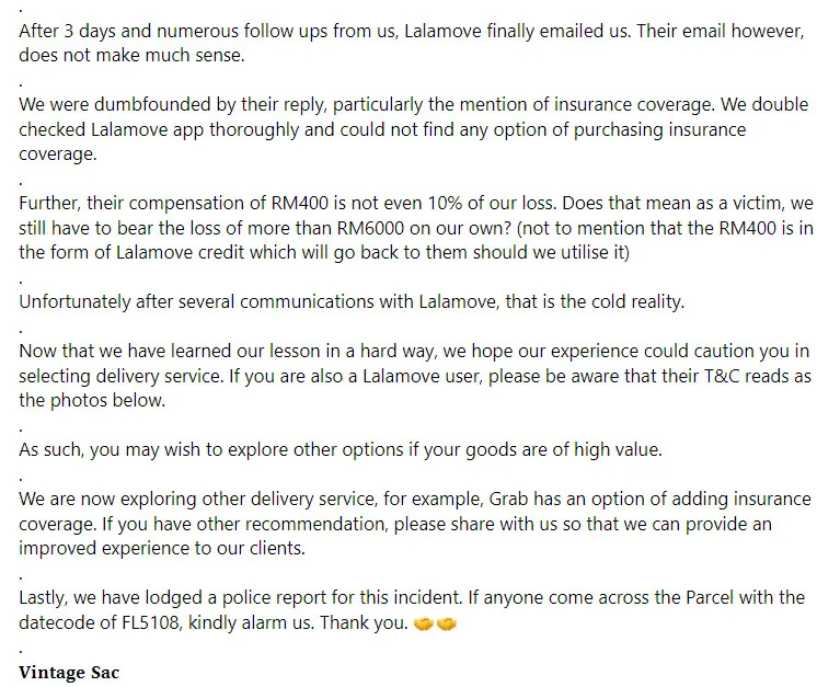 Furthermore, the admin of the Facebook account said that the parcel delivery service only offered a compensation of RM400, which only makes up 10% of their loss. “Does that mean as a victim, we still have to bear the loss of more than RM6000 on our own? Not to mention that the RM400 is in the form of Lalamove credit which will go back to them should we utilise it. Unfortunately after several communications with Lalamove, that is the cold reality,” they added in their post.