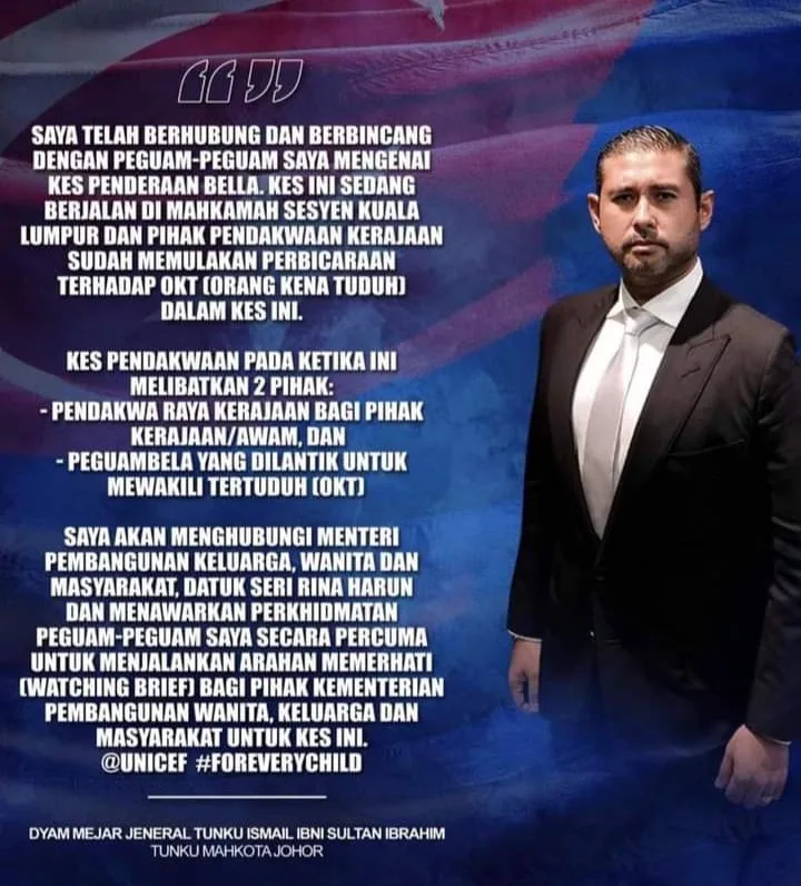 “We extend our gratitude (to the Johor Prince) for offering free legal services to hold a watching brief on behalf of the Ministry for the case. This is very meaningful for the ministry in strengthening efforts to uphold justice for Bella,” the Minister said in her statement.
