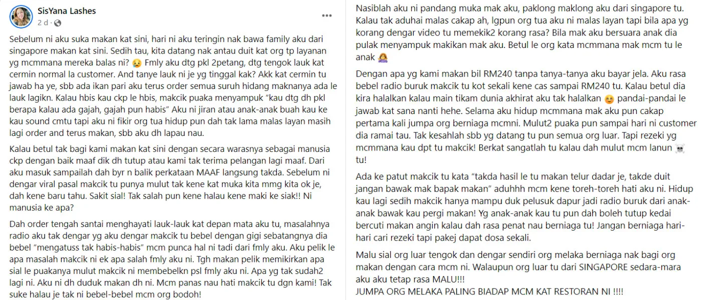 The customer, Sis Yana Lashes, took to her Facebook to detail her unfavourable experience while having her meal at the restaurant with her family (and relatives from Singapore). She shared, “We arrived around 2pm that day. After looking through the side dishes offered at the restaurant, I asked the lady, ‘Is this the only food left?’ to which she briefly responded, ‘Yes’. Afterwards, another woman chimed in and said, ‘Look at the time you arrive. Even if we serve elephants (at the restaurant), they would be gone by now’.”