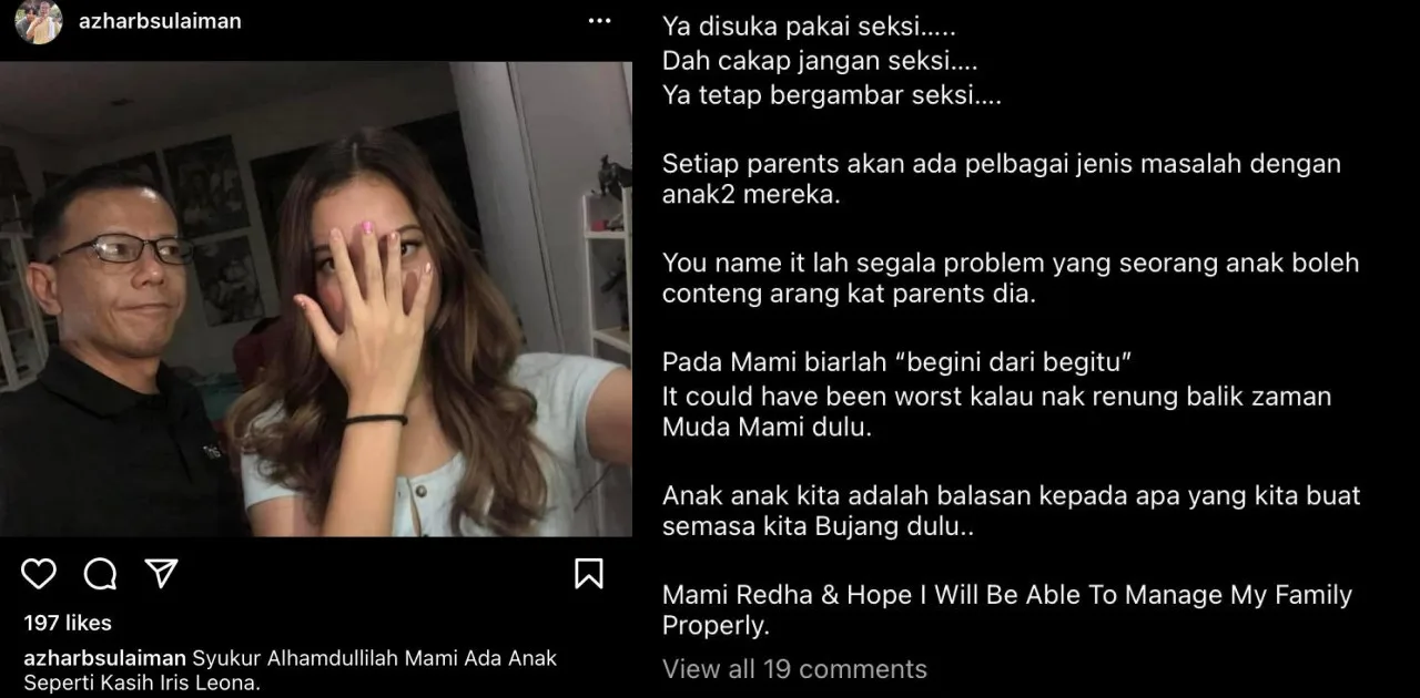 “Alhamdulillah, thank God because I have a child like Kasih Iris Leona. Yes, she likes to wear revealing outfits. I told her not to wear those sexy clothes, but she still posted photos of her posing in sexy outfits. Every parent will encounter all sorts of problems with their children,” the 51-year-old actor wrote on his Instagram post.